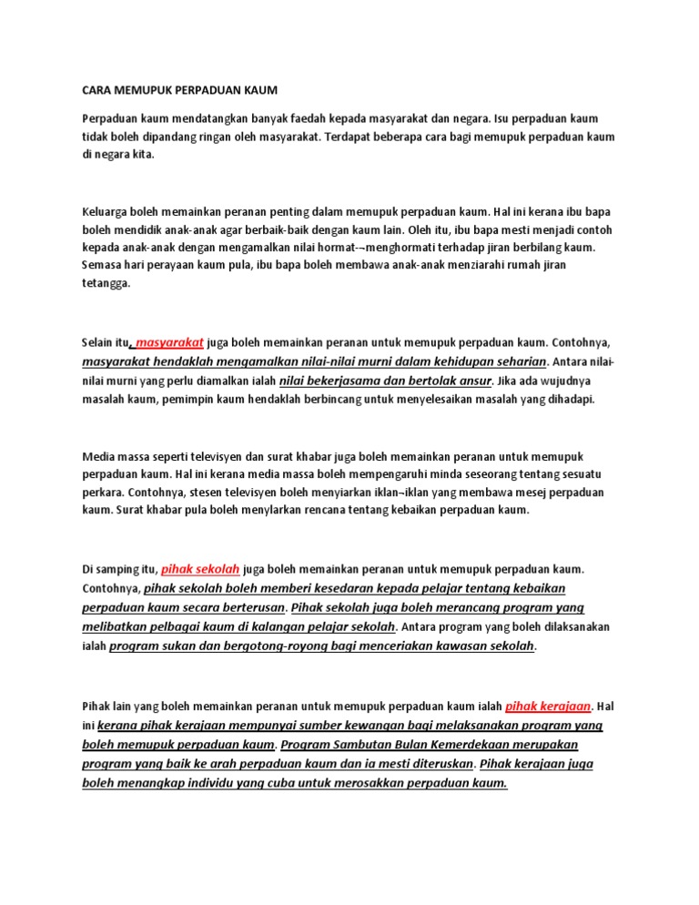Cara Memupuk Perpaduan Dalam Kalangan Pelajar Doc Document from cdn.vdocuments.net Justeru, peranan rakyat sendiri tidak boleh dinafikan kepentingannya dalam usaha memupuk perpaduan kaum di negara kita. Sejak 31 ogos 1957, penduduk malaysia yang terdiri daripada masyarakat berbilang kaum hidup bagai aur dengan tebing. Antara impak yang timbul akibat ketiadaan perpaduan ialah peperangan, sikap saling bergaduh dan juga ketiadaan pertumbuhan ekonomi yang stabil di sesebuah negara itu. Penggunaan satu bahasa perhubungan dan persefahaman di antara satu kaum dengan yang lain dapat diwujudkan tanpa menimbulkan rasa curiga. Antaranya dasar pecah dan perintah yang dilaksanakan semasa penjajahan british telah menyukarkan usaha menyatupadukan kaum menjelang kemerdekaan negara. For more information and source, see on this link : Cara memupuk perpaduan dalam kalangan pelajar. Konklusinya, perpaduan merupakan tunjang dan asas negara malaysia.